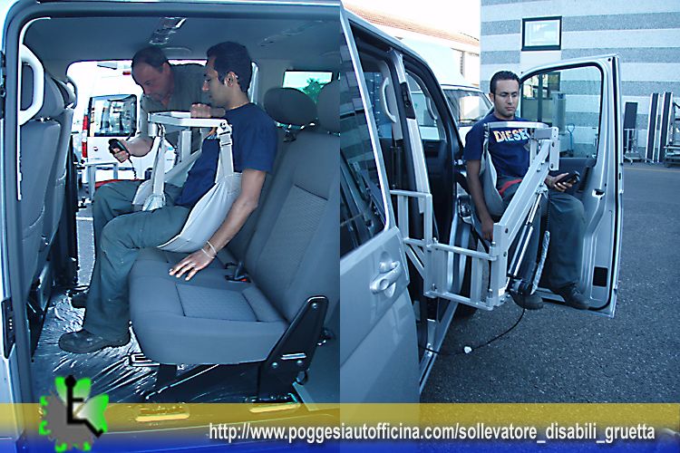 In questo furgone la staffa per la gruetta solleva persone viene installata sul montante centrale dalla parte posteriore,e permette l'accesso del disabile sia sul sedile lato passeggero anteriore sia posteriore